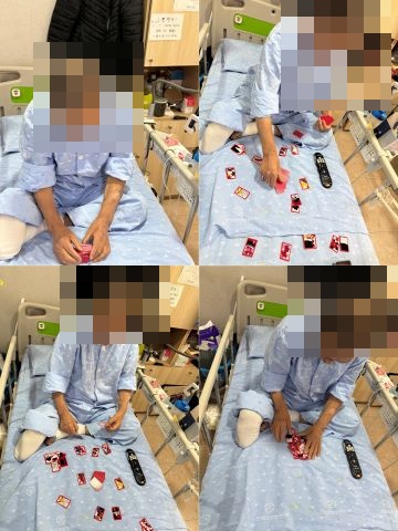 한 환자분께서는 “처가에서 칠 때는 멋모르고 짝 맞추기만 했다”며 계산이 서툴렀던 옛 이야기를 꺼내 주셨고, 게임이 진행될수록 점점 승부욕이 생기며 집중하시는 모습을 보여주셨습니다. 화투를 처음 배웠던 이야기부터 다가오는 명절이면 가족들과 음식을 두고 새벽까지 화투를 치며 웃고 떠들던 추억, 어머니께 처음 배웠다는 ‘민화투’ 이야기까지 자연스럽게 이어지며 병실에는 정겨운 웃음소리가 가득 찼습니다.