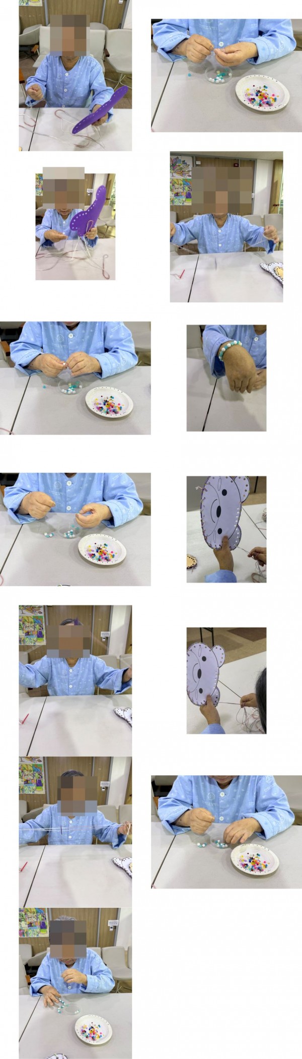 이후 팔찌 만들기 활동에서는 분위기가 한층 밝아졌습니다. 작은 비즈를 손으로 집어 끼우며 손가락을 움직이고, 때로는 떨어뜨리기도 하고 한 번에 쏙 넣으며 웃음꽃이 피어났습니다. “이건 손주 줘야지”라며 설레는 표정도 보이셨습니다.