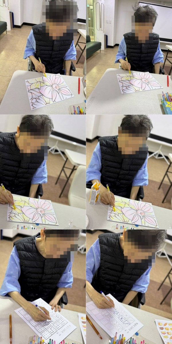 틀린 그림을 찾고 점선을 따라 그리며 집중력을 발휘하시는 어르신 등