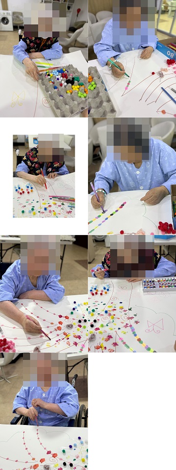 이번 활동은 풍선, 색연필, 물감, 털실, 습자지 등 다양한 재료를 활용한 미술활동으로 창의력과 표현력을 자극하고, 소근육 사용을 통한 신체 자극과 정서적 안정, 그리고 서로의 작품을 보며 소통하는 사회적 교류를 돕는 인지·정서 자극 프로그램이었습니다.