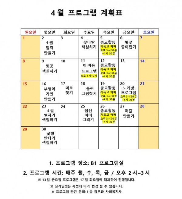 4월 사회복지 프로그램 계획표 페이지 정보 작성자 최고관리자 작성일18-04-05 13:35 조회8,578회 댓글0건 관련링크 이전글 다음글 본문 4월 사회복지 프로그램 계획표 목록